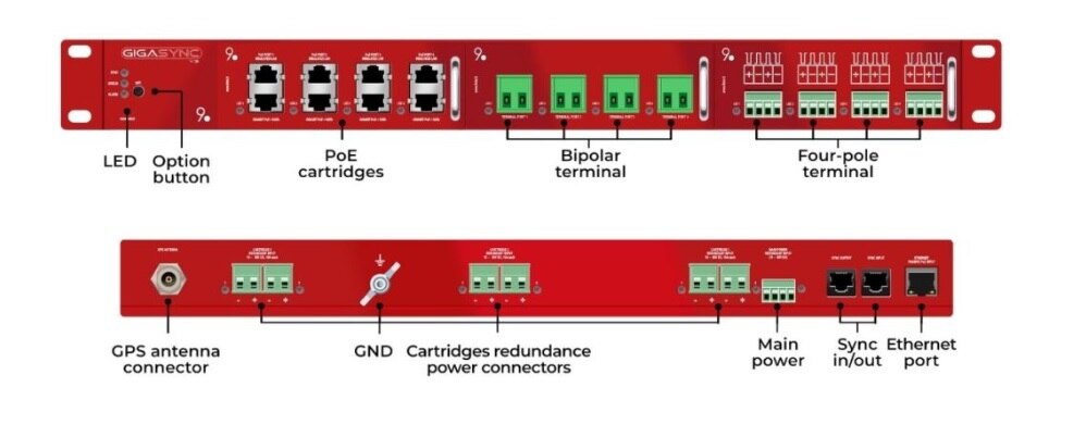 The GigaSync Base Unit can host up to 3 cartridges. Each cartridge has 4 ports that can be PoE injectors or Power Terminals (bipolar or 4-poles). The Cartridges can be chosen at the base of the needs and can be inserted and removed during normal operation with automatic detection, as well as being hot-swappable.