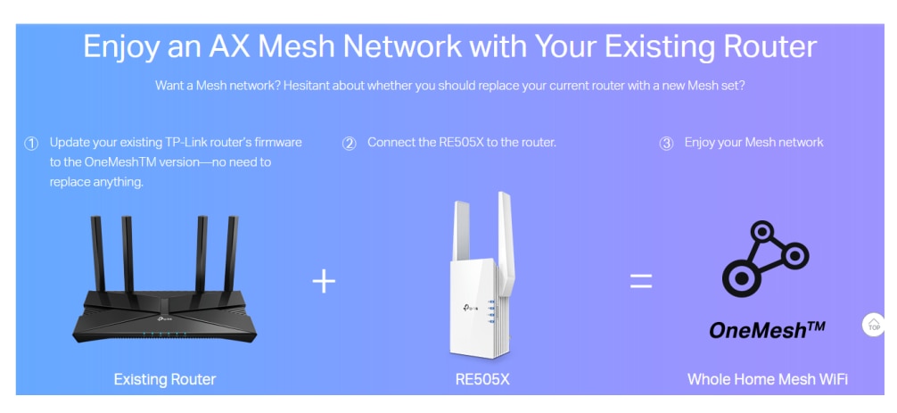 OneMeshTM is a simple way to form a Mesh network with a single WiFi name for seamless whole-home coverage. Just connect an OneMeshTM range extender to an OneMeshTM router so you can stop searching around for a stable connection.