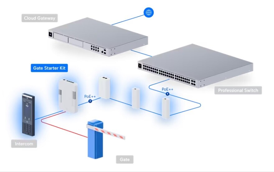 Starter kit with a Gate Hub, G3 Intercom, PoE++ adapter, and PoE++ over twisted pair extender for access control at a single gate with Touch Pass support.