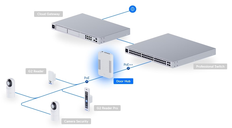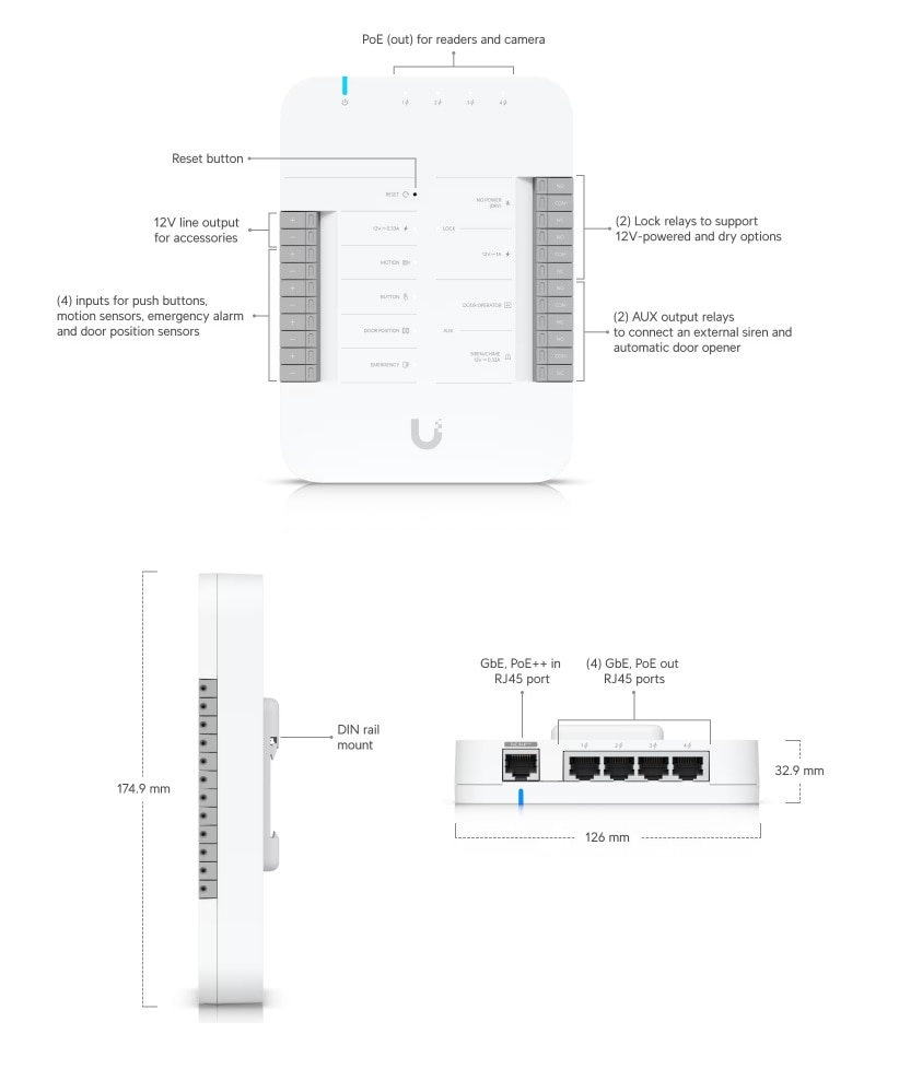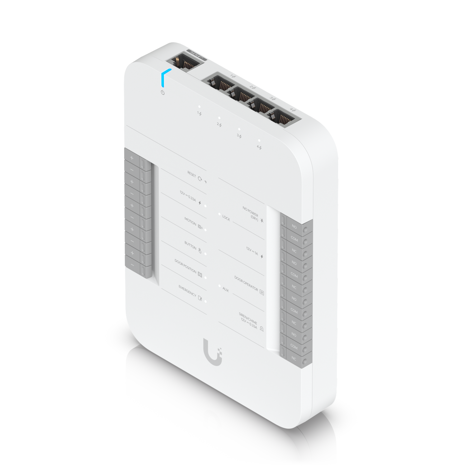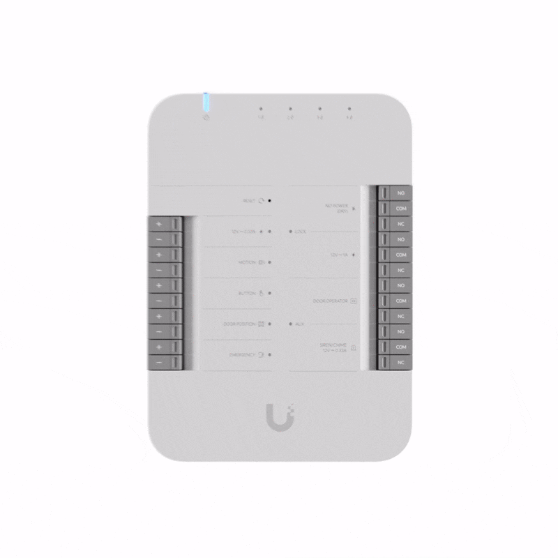 - Connect to two UniFi Access readers and two UniFi Protect camera or UniFi Protect Chime