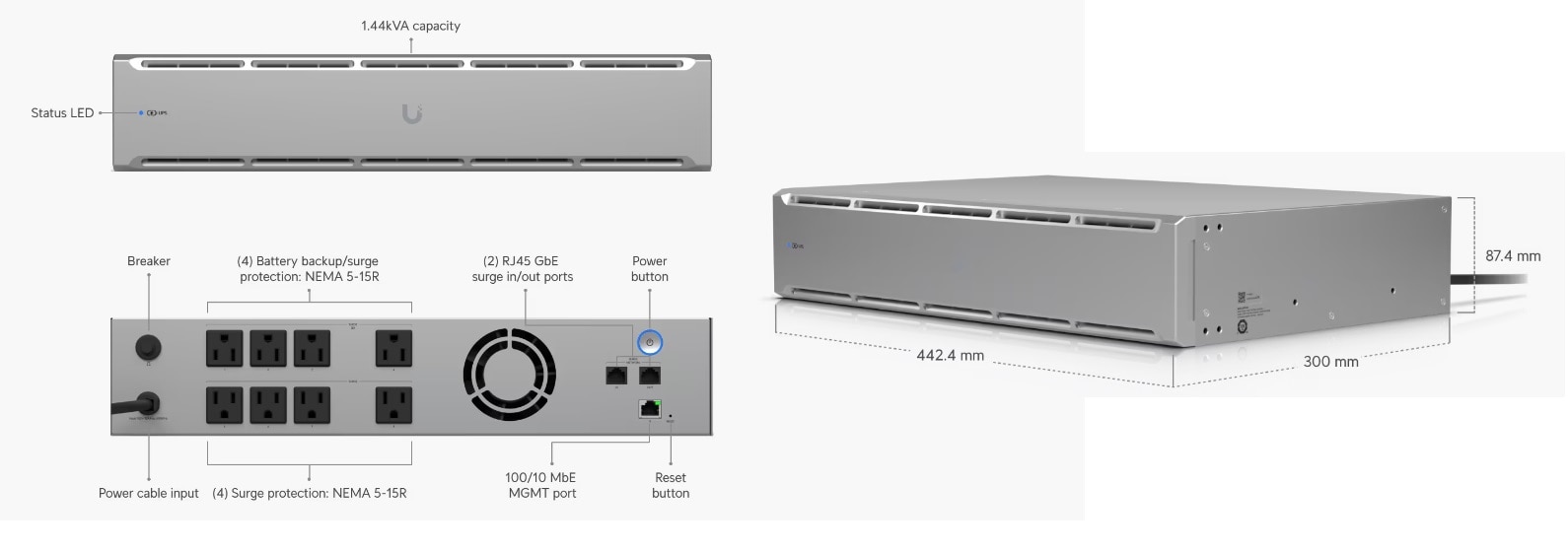 UniFi managed 1.44kVA rackmount uninterruptible power supply with 8 outlets and field replaceable battery, 216Wh, half load (500W) runtime of 8 minutes, UniFi Alarm Manager ready and NUT support for 3rd party devices.