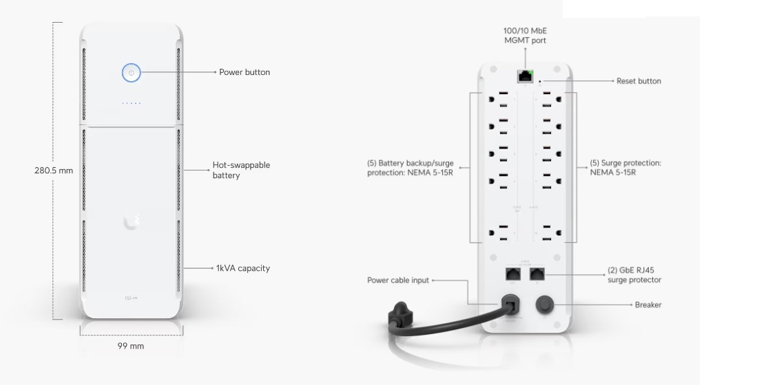 UniFi managed 1kVA uninterruptible power supply with 10 outlets and hot swappable battery, 108Wh, half load (300W) runtime of 7 minutes, UniFi Alarm Manager ready and NUT support for 3rd party devices.